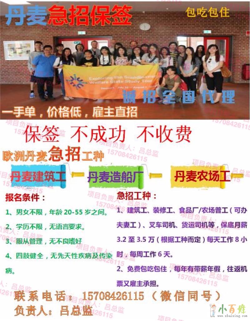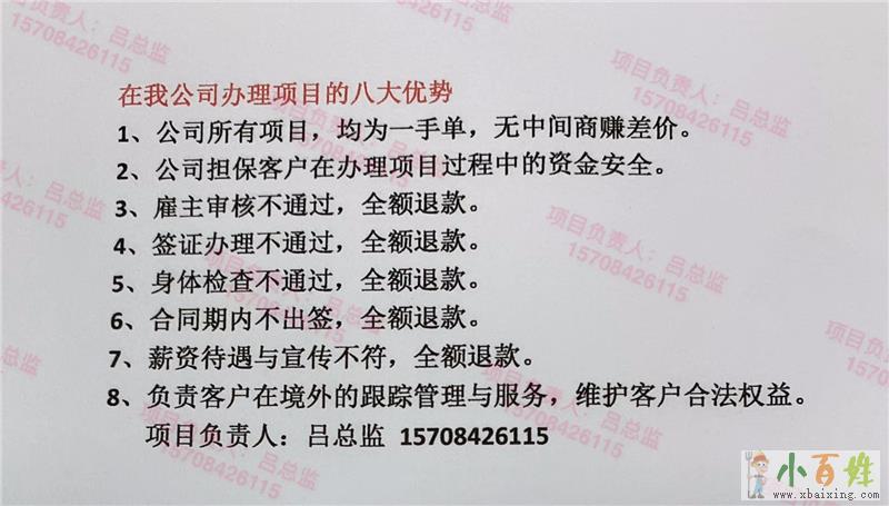 一手单,出国劳务保签,保证项目真实可靠,不成功不收费诚招各区域代理,手上人脉资源丰富优先,报酬丰厚(非诚勿扰)公司宗旨:诚实守信,共创双赢,成功之路,你我同行(本公司各大项目不会英语均可)国家:澳大利...